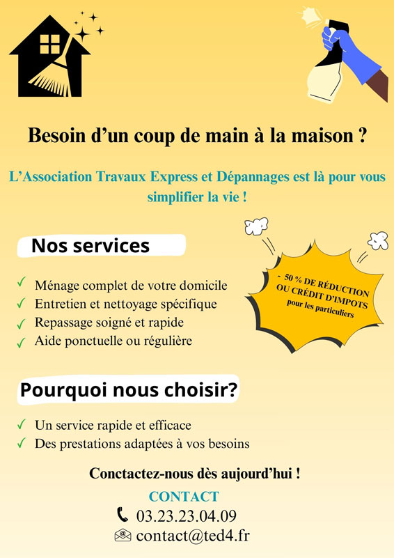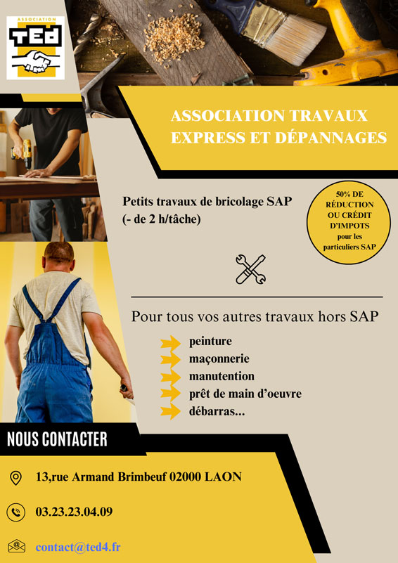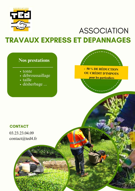 TED ASSOCIATION crée en Septembre 1989. Embauche de personnes dépourvues d’emploi pour les mettre à titre onéreux à la disposition de tiers utilisateurs, qui doivent être adhérents de l’Association, pour des activités ne faisant pas concurrence aux activités existantes; l’organisation de la conduite de chantiers d’insertion pour des publics défavorisés, des actions de formation avec l’agrément de l’Etat.
